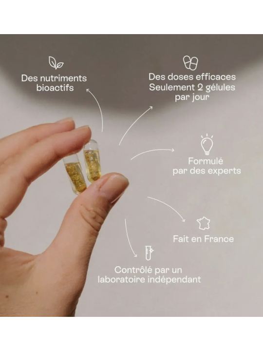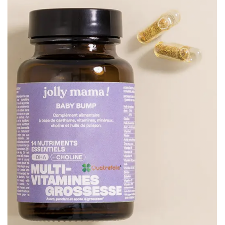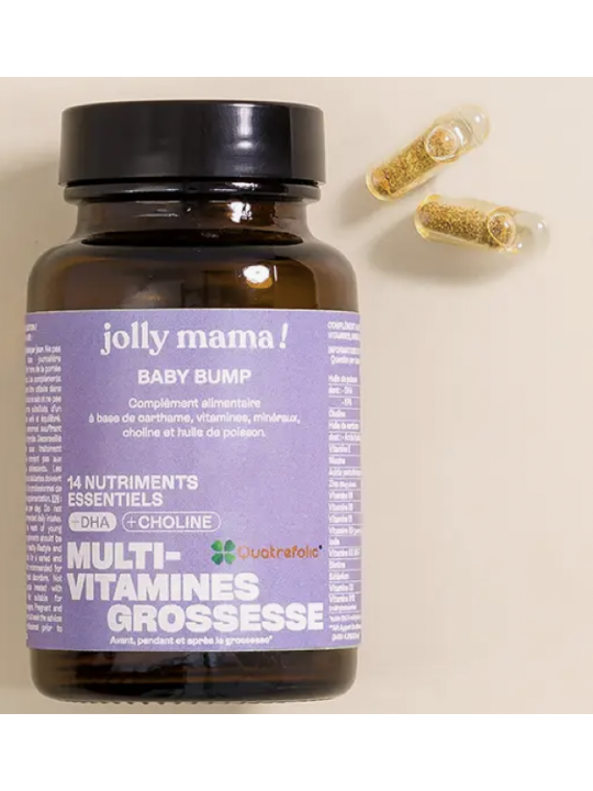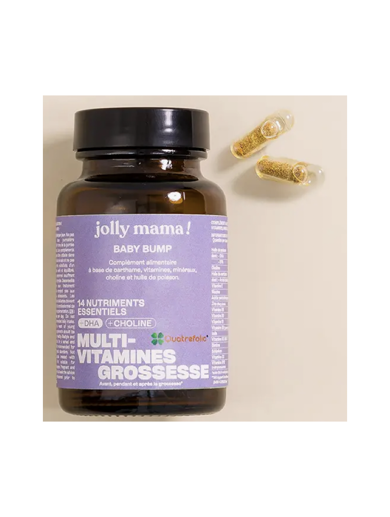 Parce qu’une bonne alimentation ne suffit pas toujours, nous avons créé Baby bump. Véritable 3 en 1, il permet de couvrir à la fois les besoins de la future maman et ceux de son bébé, en combinant un complexe multivitamines grossesse (avec 16 nutriments sous forme bioactive), du DHA et de la choline. Baby bump couvre également l’apport journalier recommandé en vitamine B9 (acide folique). Il peut être pris dès le désir d'enfant, afin de préparer le corps aux besoins de la future grossesse et augmenter ses chances de grossesse. Petit plus ! Sa forme innovante de gélule "Duocaps", une capsule sèche contenue dans une capsule d’ingrédients huileux, facilite la prise avec seulement 2 gélules par jour. Le tout dans un pot en verre et avec un couvercle 100% recyclable. 60 gélules (cure de 1 mois)