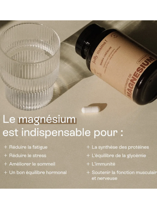 Mama-gnésium, le complément à base de bisglycinate de magnésium, pour combler vos besoins en magnésium avec la forme la mieux assimilée par le corps. D’après l’étude SU.VI.MAX, 77% des femmes ont des apports insuffisants en magnésium, pourtant ce nutriment est essentiel pour le bon fonctionnement de l’organisme, notamment pour le bien-être émotionnel. Le magnésium est indispensable, notamment pour l’énergie, l’équilibre hormonal, la synthèse des protéines, la glycémie, l’immunité et la fonction musculaire et nerveuse. Un apport optimal en magnésium est bénéfique pour réduire le stress, améliorer le sommeil et réduire la fatigue.