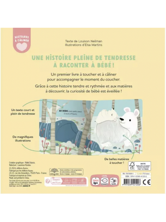 Un premier livre à toucher et à câliner pour accompagner le moment du coucher. Grâce à cette histoire tendre et rythmée et aux matières à découvrir, la curiosité de bébé est éveillée !