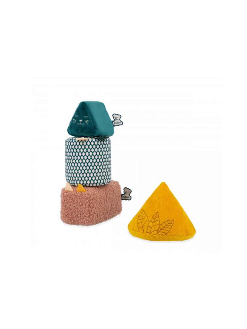 Les 4 formes, déclinées dans des tons de vert, rose, blanc et jaune, sont toutes différentes pour débuter l'apprentissage des volumes. Elles sont conçues avec des matières douces et moelleuses, telles que le polyester et le Spandex, offrant une texture agréable au toucher. Chaque forme présente des couleurs vives et contrastées, permettant à bébé de développer sa perception des contrastes visuels.