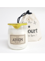 Chaque petit pot de yaourt est scellé par un opercule couleur or et livré dans son pochon en tissu.