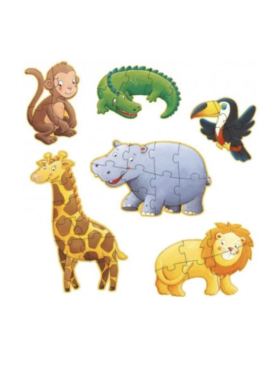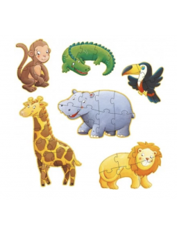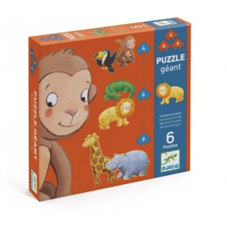 Partez à la recherche des différents animaux de la jungle avec ces puzzles géants, évolutifs et silhouettésconçus pour les enfants à partir de 2 ans. L'ensemble comprend 2 puzzles de 9 pièces (bégemote et girafe), 2 puzzles de 6 pièces (crocodile et lion) et 2 puzzles de 4 pièces (singe et oiseau toucan). Votre enfant pourra alors avancer à son rythme tout en exerçant sa patience et sa logique.