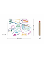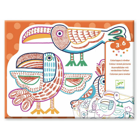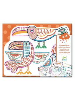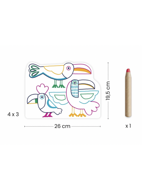 Une pochette de 12 images à colorier avec un gros crayon de couleur, adapté pour les petits enfants. L’enfant colorie les familles d’animaux à l’aide du crayon pour découvrir ce qui se cache. C’est magique : le crayon ne marque que sur certaines zones, des motifs apparaissent et révèlent des surprises !
