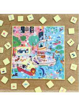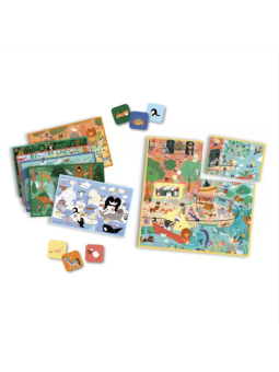 Choisis une scène et dispose autour les 6 éléments à retrouver. Le premier à trouver un élément remporte la carte ! Celui qui a le plus de cartes a gagné. En plus : retourne les 6 scènes et reconstitue un grand décor avec 66 éléments à trouver ! Contenu : 66 tuiles, 6 planches