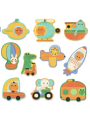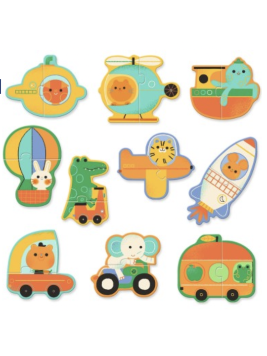 Puzzle duo Véhicules est un puzzle éducatif pour les tout-petits sur le thème des véhicules. L’enfant associe les 2 parties d'un véhicule conduit par un adorable petit animal. À partir de 2 ans.