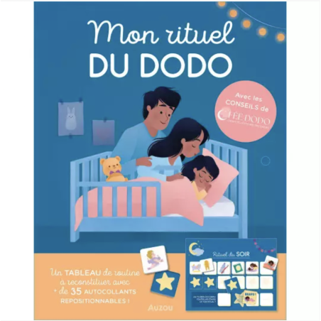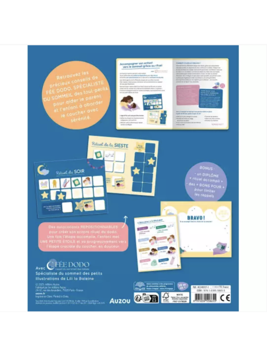 Grâce à ce tableau de rituel et ses autocollants repositionnables, l'enfant et le parent peuvent construire leur propre rituel de coucher. Ensuite, chaque fois qu'une étape du rituel est accomplie, l'enfant ajoute une étoile sous l'étape. Il est ainsi accompagné tout en douceur au moment du coucher. Le rituel de la sieste est aussi inclus, ainsi que des "bons pour" pour limiter les rappels et un petit diplôme pour féliciter l'enfant à la mise en place du rituel. Le tout accompagné par les très précieux conseils de Fée Dodo, expert en sommeil des bébés et jeunes enfants.