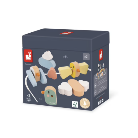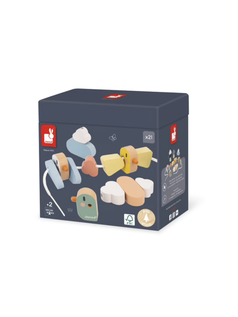 Il assemble les 21 perles en bois du jeu Janod grâce aux 4 perles oiseaux, 8 perles pour les ailes et les 9 perles pour former les nuages et créer une joyeuse parade dans le ciel tout en stimulant sa motricité fine.