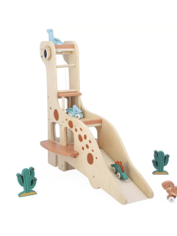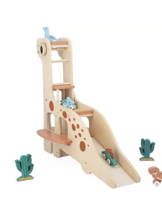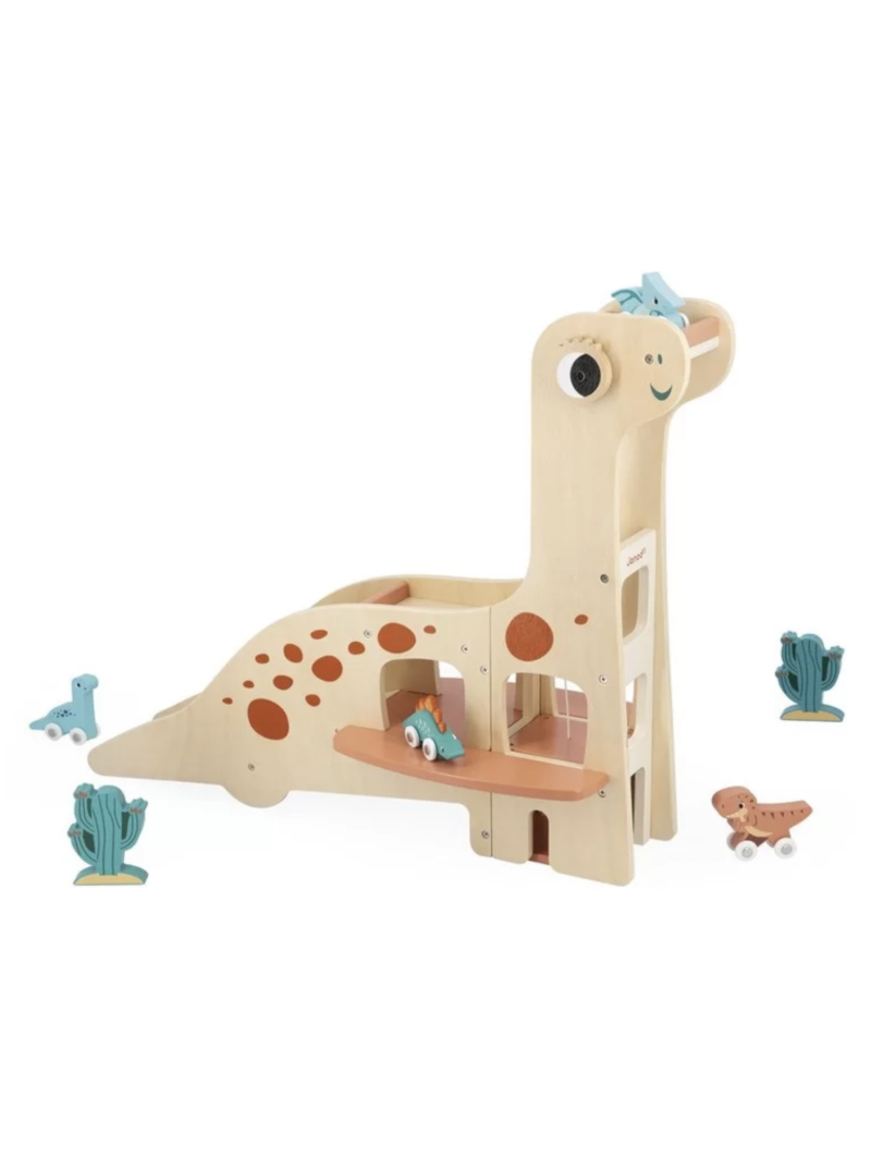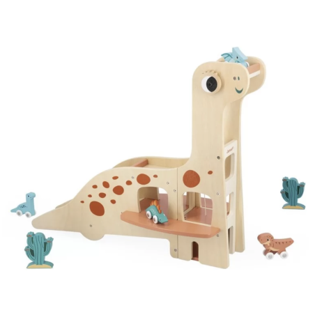 Voici un magnifique garage en forme de diplodocus. Les 4 dinosaures à rouler pourront partir vadrouiller et revenir au garage pour se reposer…