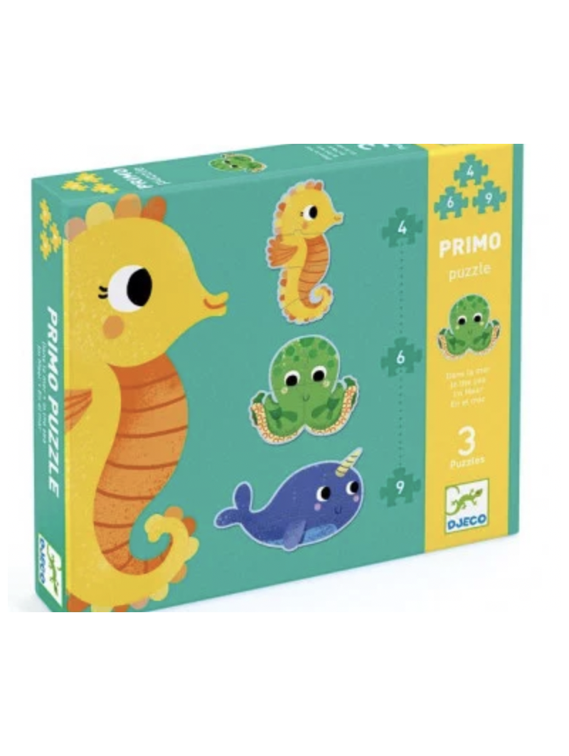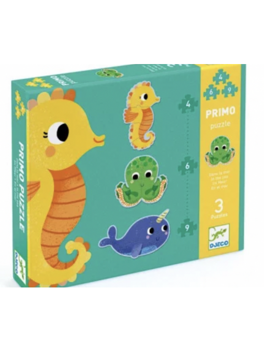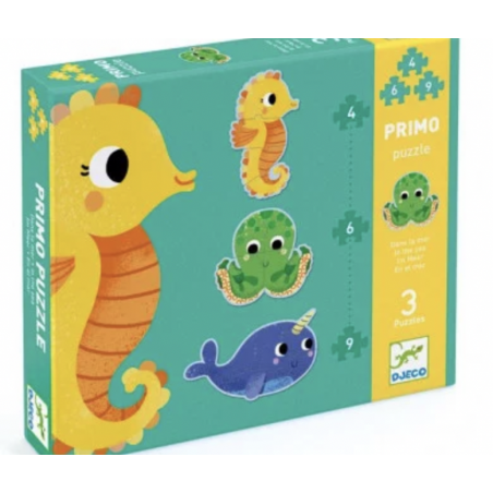 Découvrez le primo puzzles Dans la mer de Djeco, un coffret comprenant 3 puzzles évolutifs et silhouettés de difficulté croissante pour les enfants dès 2 ans.