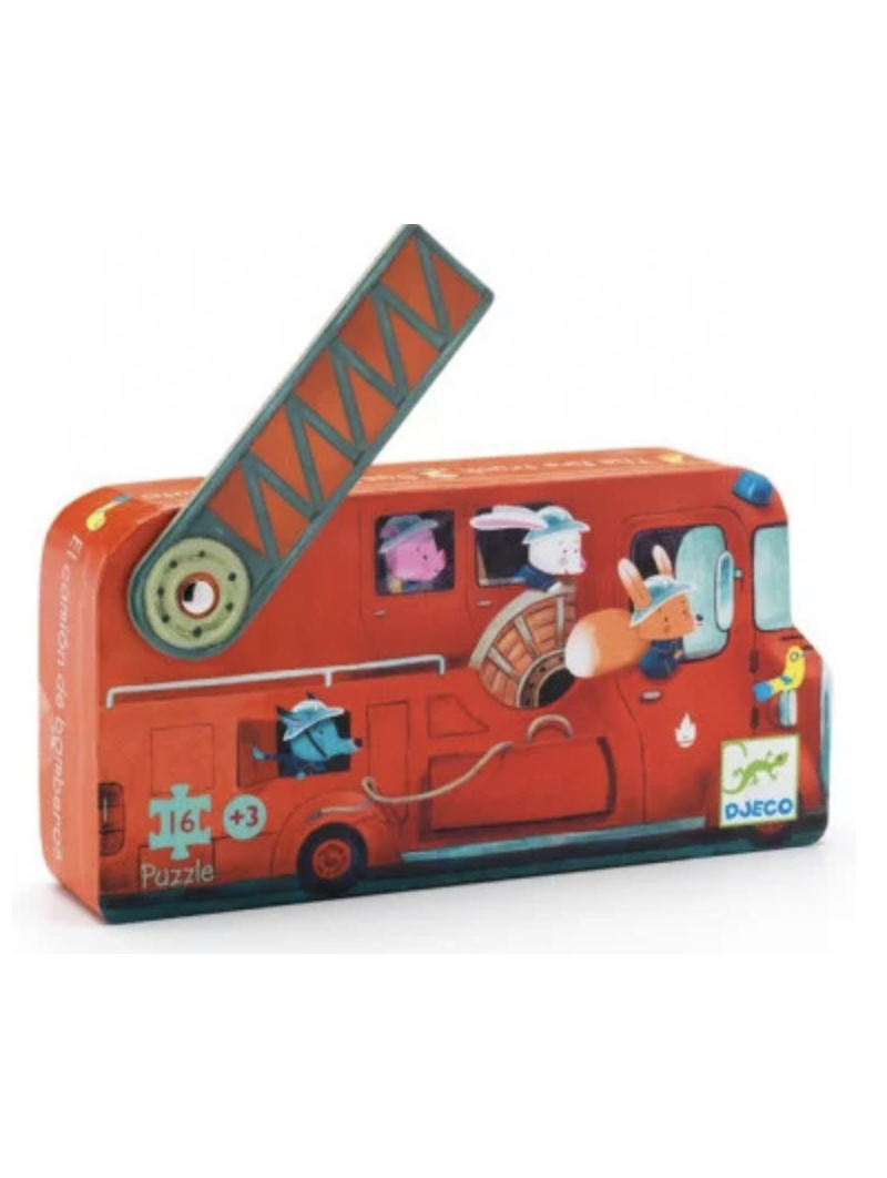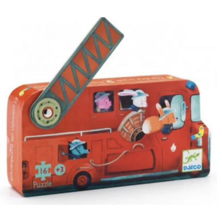 Découvrez le puzzle Camion de pompier de Djeco, un magnifique puzzle de 16 pièces pour les enfants dès 3 ans, présenté dans une boite silhouette tout en rondeur avec une échelle mobile sur le dessus.