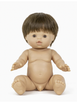Poupée en vinyle avec cheveux et parfumée à la vanille.