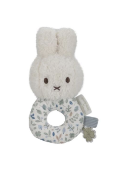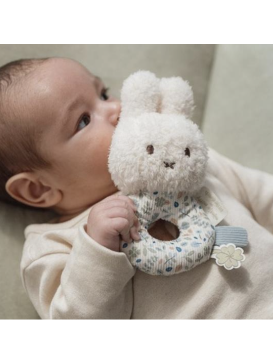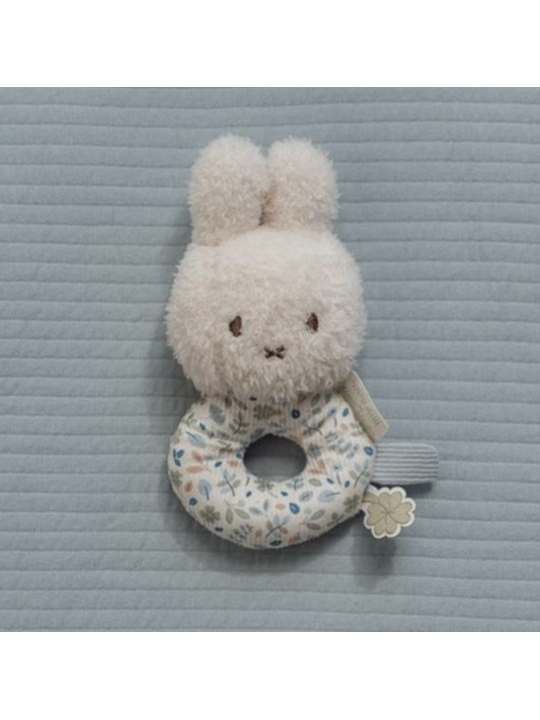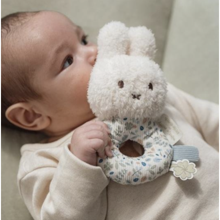 C'est miffy et elle fait du bruit ! Chaque fois que vous déplacez miffy, vos efforts sont récompensés par un son de hochet. Le hochet en forme d'anneau est décoré de l'imprimé Lucky Leaves de Little Dutch et peut être facilement saisi par les petites mains des enfants. Le hochet comporte trois petites étiquettes à explorer et un miffy sympathique à manipuler.