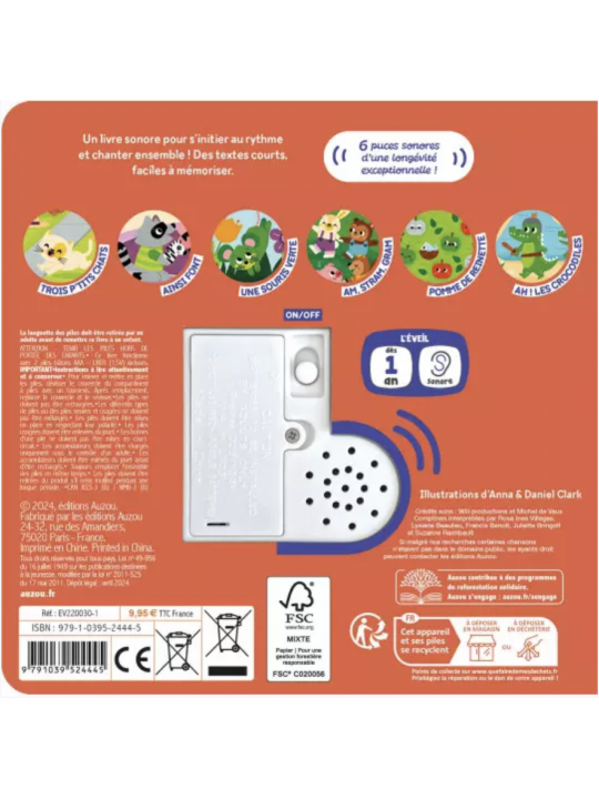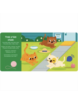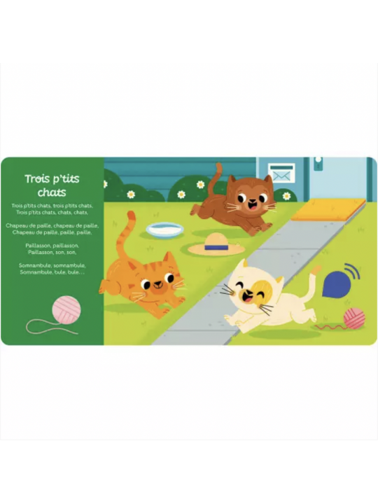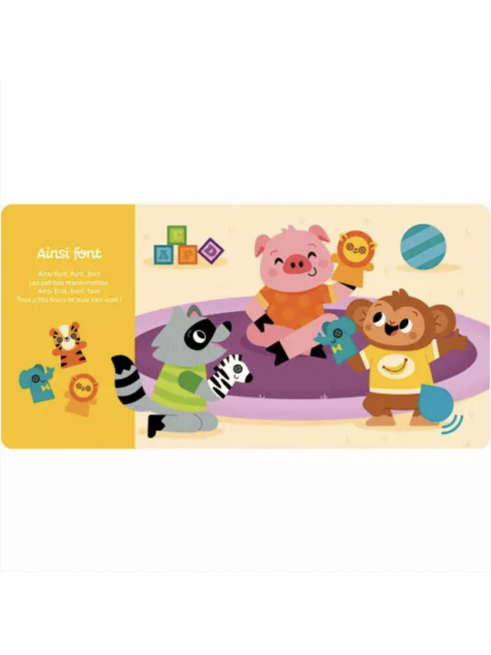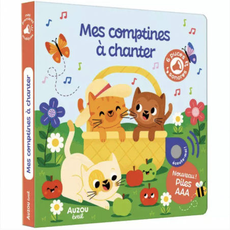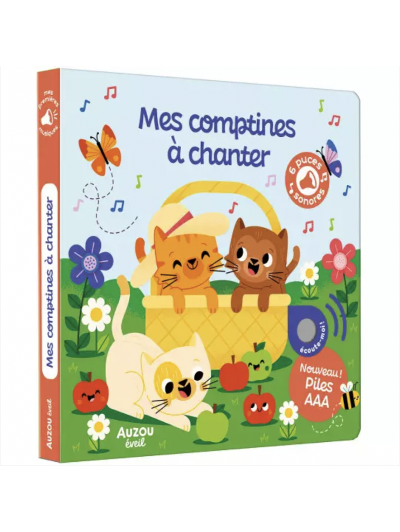Des comptines courtes, faciles à mémoriser, chantées en crèche et en maternelle. L’ouvrage contient un bouton on/off (pour durer plus longtemps) et des piles AAA (faciles à changer) ! 6 comptines : - Trois p’tits chats - Ainsi font - Une souris verte - Am, stram, gram - Pomme de reinette - Ah ! Les crocodiles