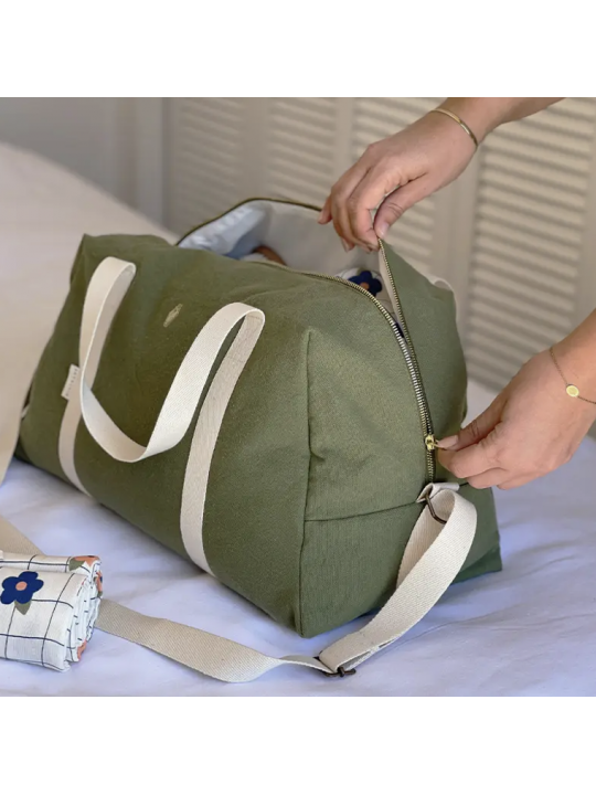 Composition : tissu 100 % coton Doublure : intérieur imperméable en coton enduit Tissu certifié Oeko-Tex Standard 100 Dimensions : longueur 51 cm x largeur 30 cm Compartiments : grande ouverture avec fermeture éclair dorée, 3 poches intérieures 3 poignées, dont une ajustable Entretien : lavable en machine à froid Fabriqué au Portugal