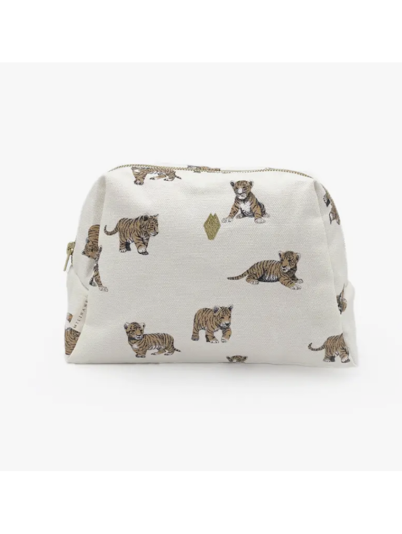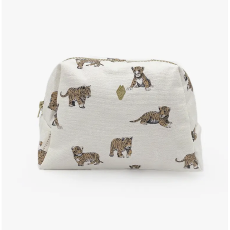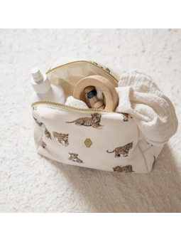 La trousse de toilette Tigre de la marque Milinane est la trousse parfaite avec un bébé. Elle est assez grande pour ranger tous les essentiels de bébé : lingettes, liniment, gel douche, brosse, thermomètre, tétine, sérum physiologique… Elle possède même une poche intérieure afin de mieux organiser tous ses produits.