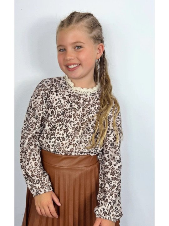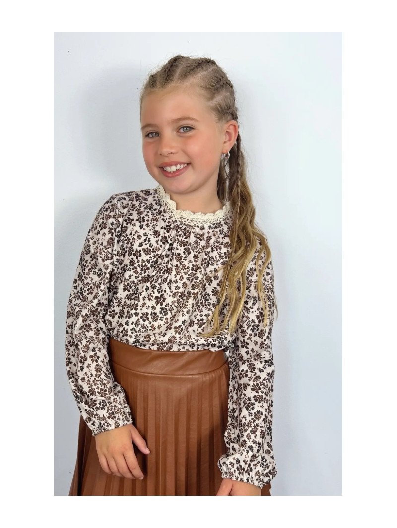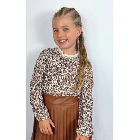 Un vent de romantisme souffle sur la garde-robe avec cette blouse légère à imprimé fleuri, idéale pour les petites filles coquettes. Son col en dentelle crème et ses manches froncées lui donnent un charme délicat, parfait pour les looks habillés ou casual chic.